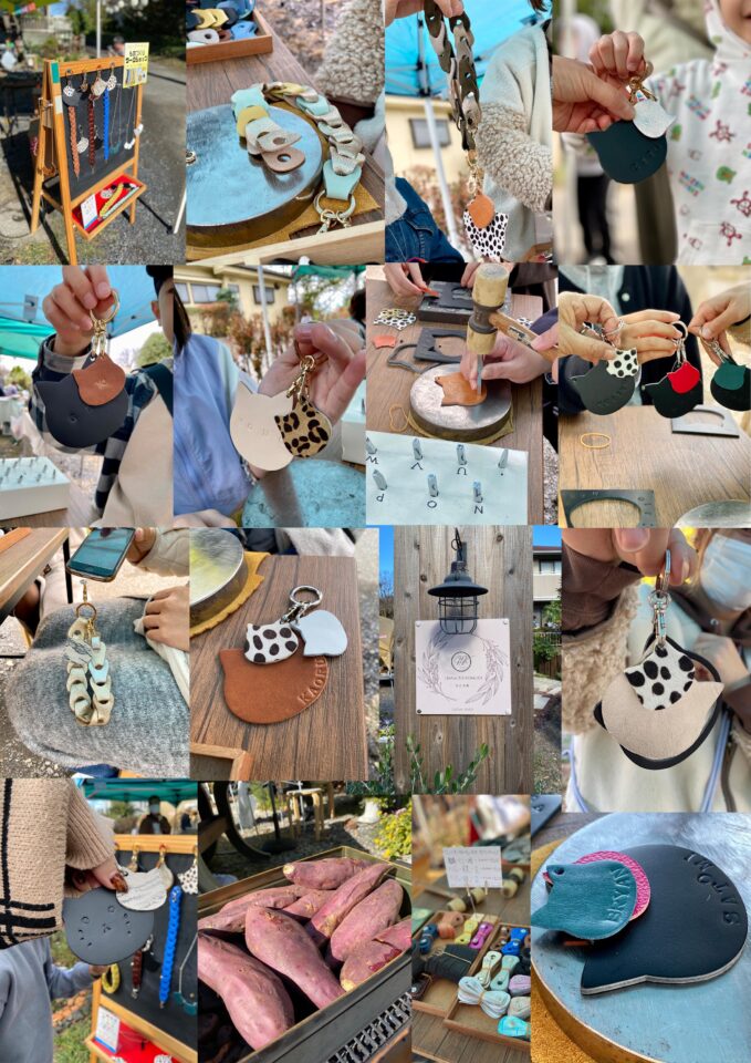 革のパーツを組み合わせて作るストラップと、猫の形のチャームにアルファベットの名入れをするワークショップです。